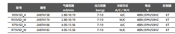 描述 - IE2变频电机,防护IP55,电源400V/3ph/50Hz - 英格索兰主机,带有背对背圆锥滚柱轴承 - 内置变频器 - V-ShieldTM 技术 - 冷却系统 - KT控制器面板防护 NEMA4/IP65 - 控制柜柜体防护IP44 - 不锈钢空气排气管路(后冷出) - 出厂灌装Ultra-Coolant 冷却剂,使用长达8,000小时或2年 - KT智能控制器: - 可通过非标需求实现最多8台采用KT控制器空压机自联控 - Modbus RTU 通信协议 - 标配暖机功能 - 开/关机命令来源状态记录功能(事件记录) - 标配RS485通信接口,支持MODBUS通讯协议 - 标配机组排气压力/主机排气温度信号输出4~20mA 转换功能 - 标配直流电抗器 - 风冷 69 / 水冷69 dB(A) 低噪音 - 机组尺寸 (mm): 2432 x 1265 x 2032 - 机组重量 (kg): -R55 风冷 1876; 水冷 1769