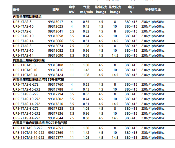 描述 一体化储气罐型空压机供货范围: -风冷型40度环境温度设计,满足全天候运行的要求 -一体化主机,内置双层圆锥滚柱轴承设计 -380-415v/3ph/50hz, IEC 标准设计, IP55 TEFC三相感应电机 -自动启/停控制 &恒速运行 控制器 -继电器控制器 -冷热室隔离设计 -噪音声压为:65 - 69 dBA -易于维护保养的Poly-V 型皮带驱动装置 -高效“节能之星"循环冷冻式干燥机 -230v/1ph/ 50Hz 单一控制电源接口 -不锈钢翅片式换热器 -双重高效过滤器:初级加精级过滤器 -内置式高效气水分离器 -一体化的整合式离心冷却风扇 -单一的带电子排污阀的排污口 - 机组尺寸 (mm): 底座型:1042 L x 734 W x 914 H 带272升储气罐型:1311L×763W×1433H -机组重量(kg):底座型:330, 带272升储气罐型:455